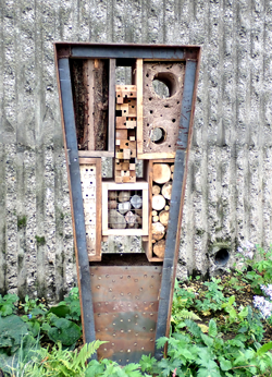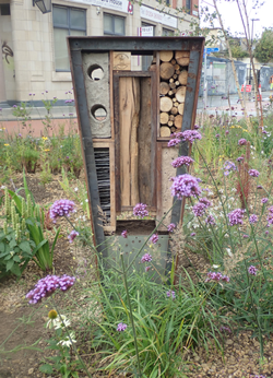 BioDiversity Boxes. Commissioned following discussions with Sheffield City Council as part of the Grey To Green Project (phase 2) creating green corridors through areas of the city centre. The BioDiversity Boxes present aesthetically pleasing civic bug hotels within the planting for the SUDS area of the project. Each BioDiversity Box contains a number of habitat Elements to provide nesting and overwintering spaces for a variety of invertebrate species including: